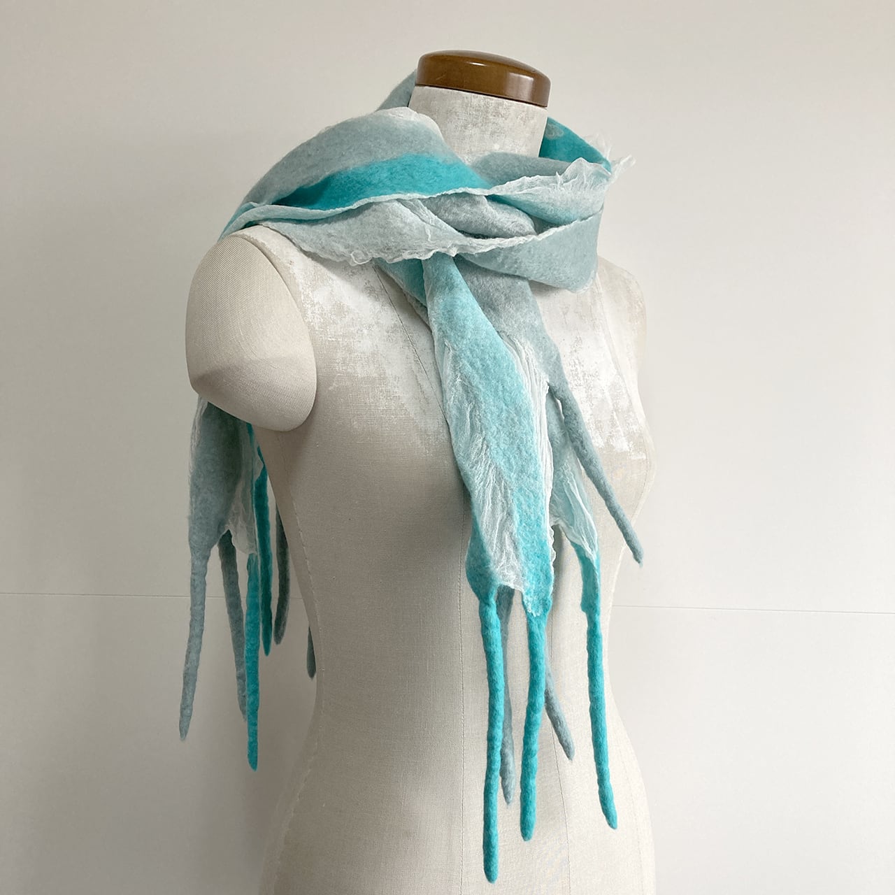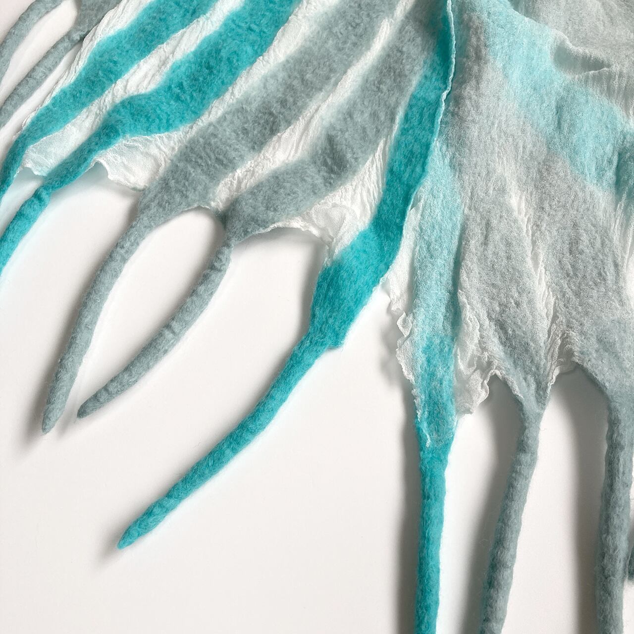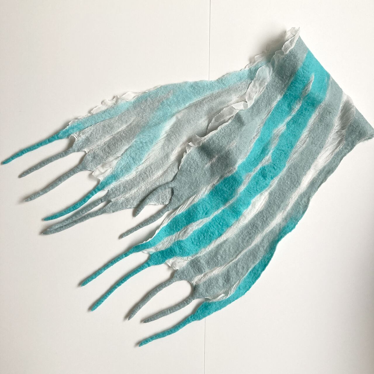 ごく薄い白のシルク布(ジョーゼットとも)とメリノ種の柔らかな羊毛による、コンパクトでとっても軽いストール。羊毛が縮む時にシルク布も絡めながら縮むので、ちりめんのような細かなシワが立体的な表情を生む。部分的な透け感や、長めのフリンジが楽しい。春先まで使えます。