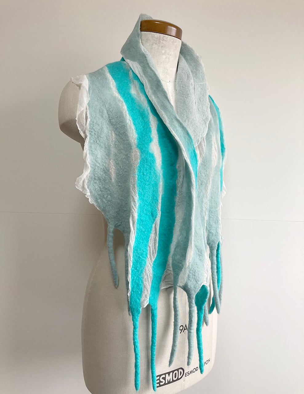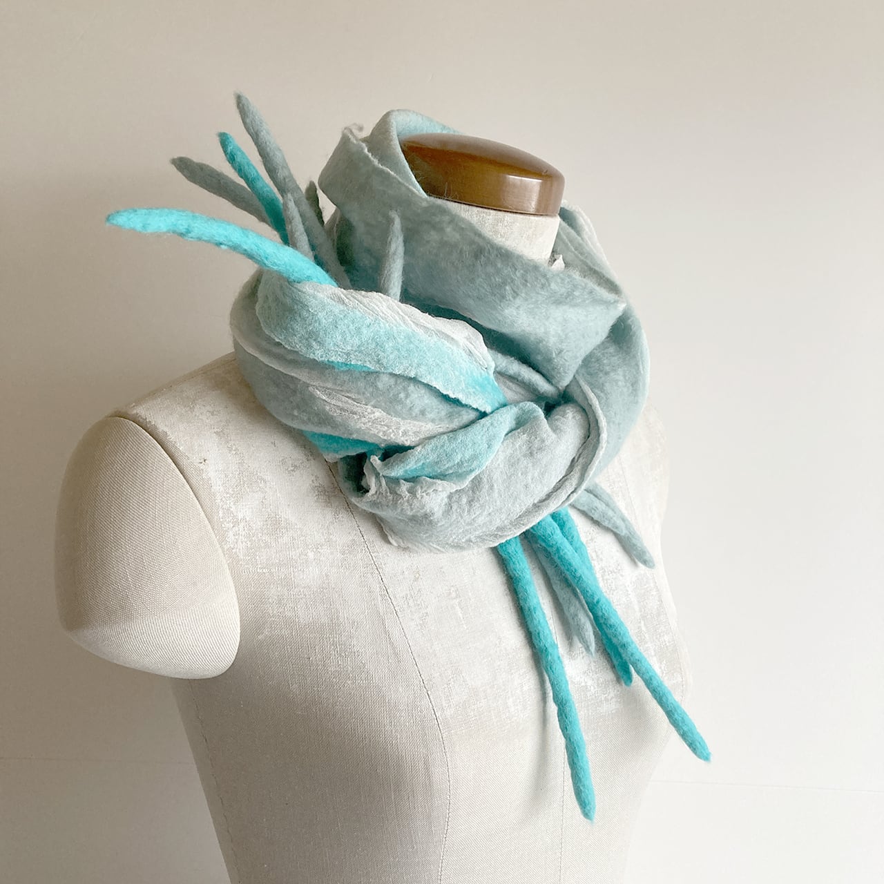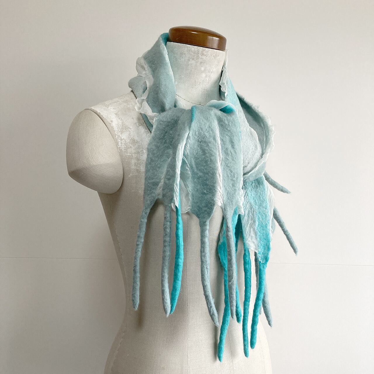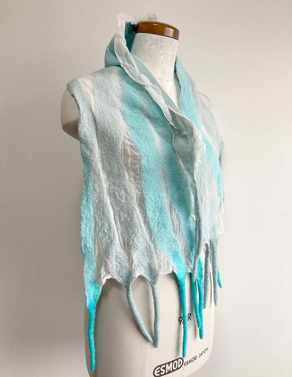 ごく薄い白のシルク布(ジョーゼットとも)とメリノ種の柔らかな羊毛による、コンパクトでとっても軽いストール。羊毛が縮む時にシルク布も絡めながら縮むので、ちりめんのような細かなシワが立体的な表情を生む。部分的な透け感や、長めのフリンジが楽しい。春先まで使えます。