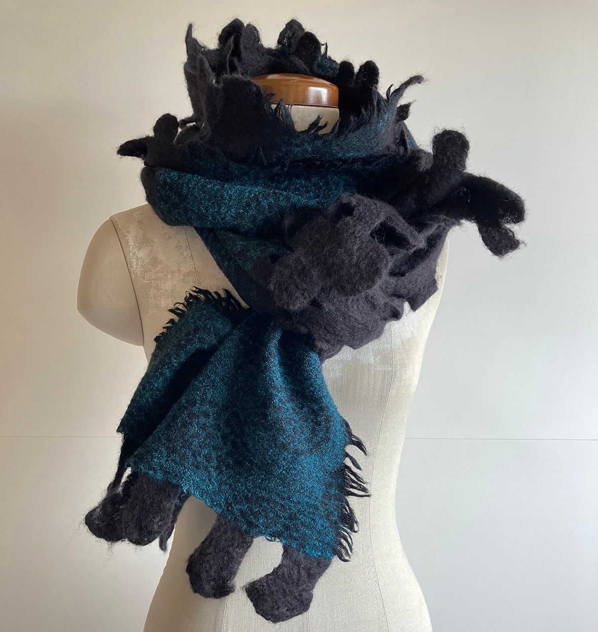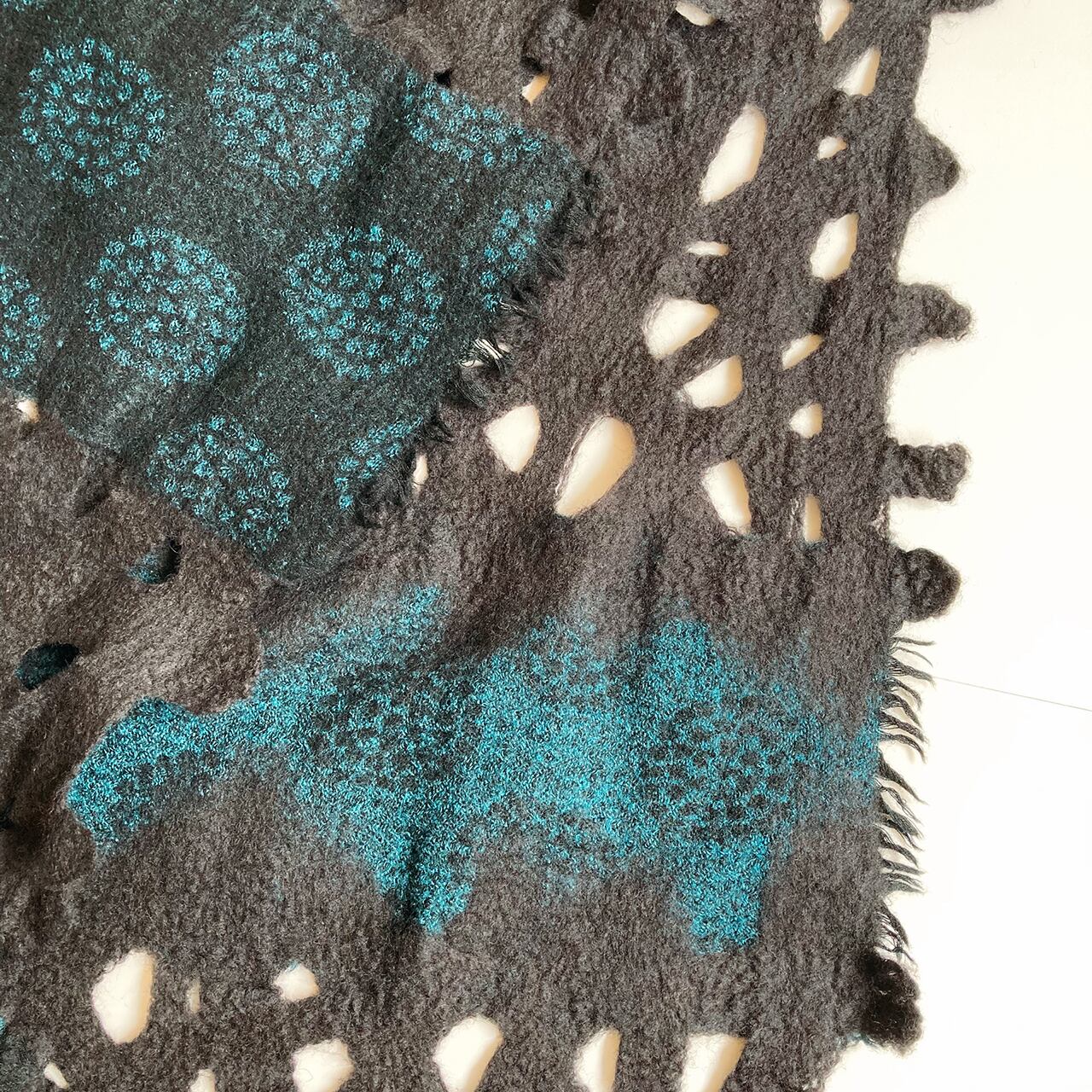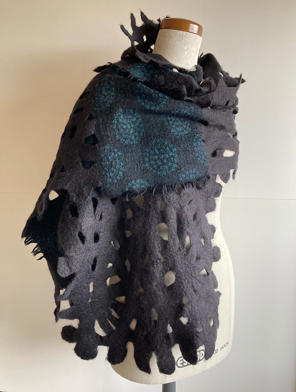 墨のようなやわらかな黒色の羊毛と花のようなデザインのダークターコイズのウール布を組み合わせた、渋い雰囲気のストール。