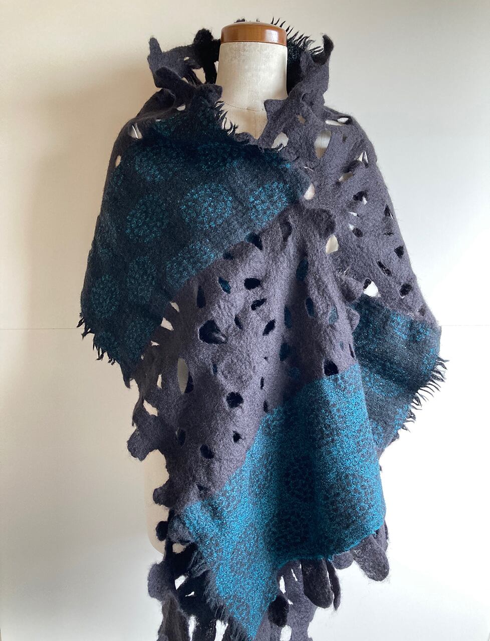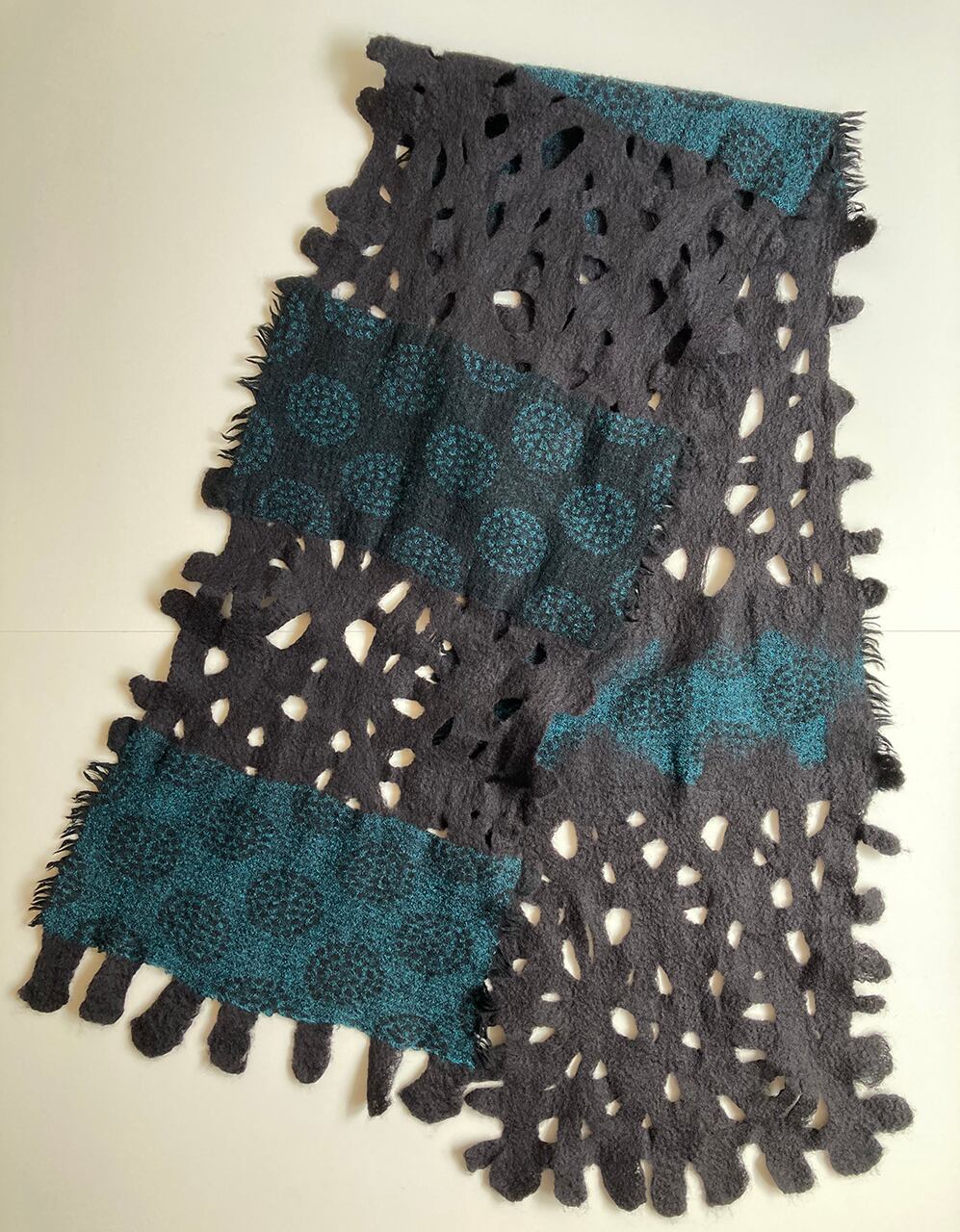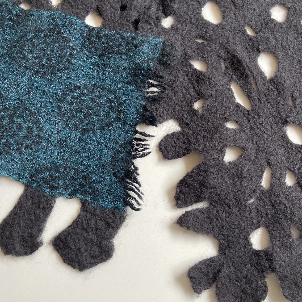 墨のようなやわらかな黒色の羊毛と花のようなデザインのダークターコイズのウール布を組み合わせた、渋い雰囲気のストール。