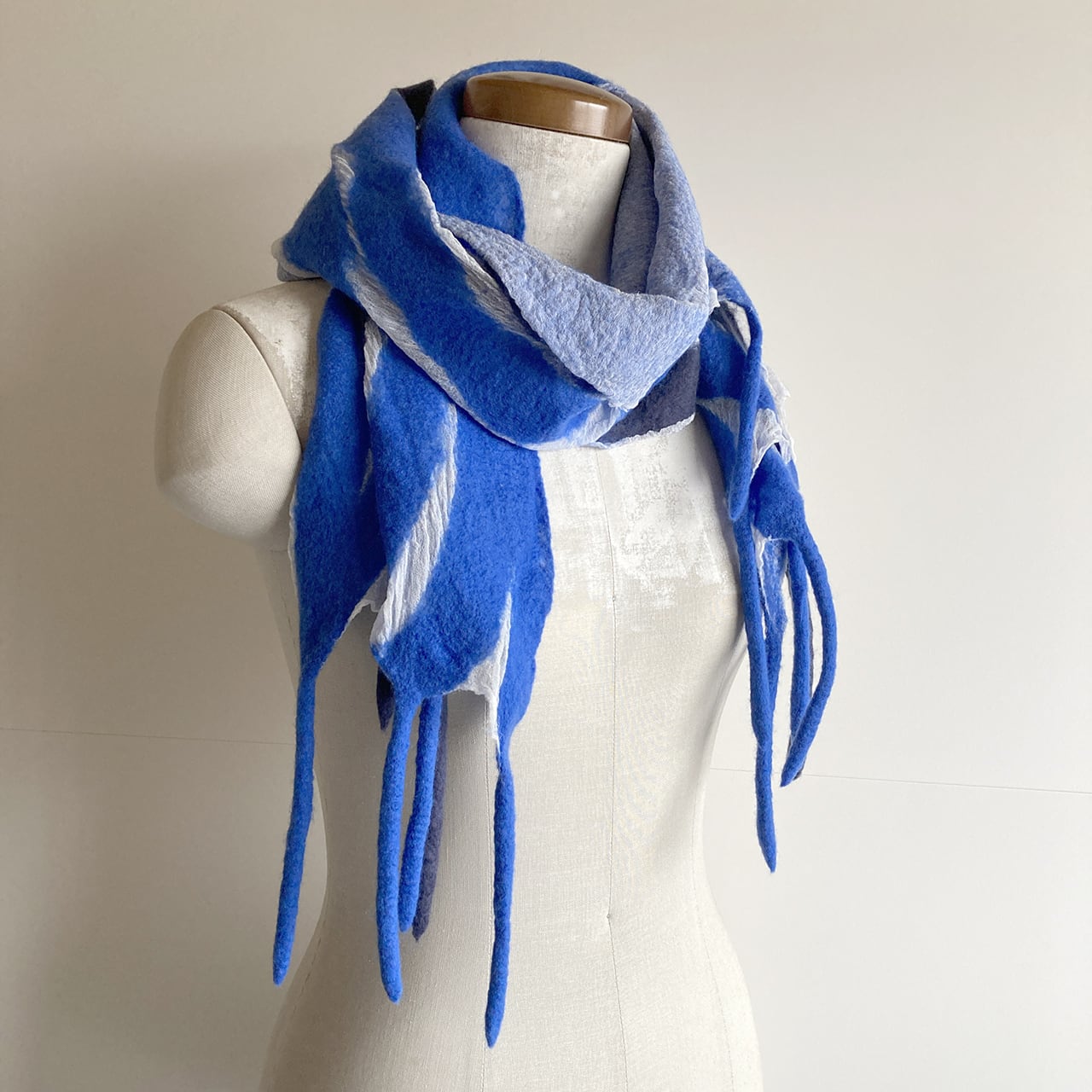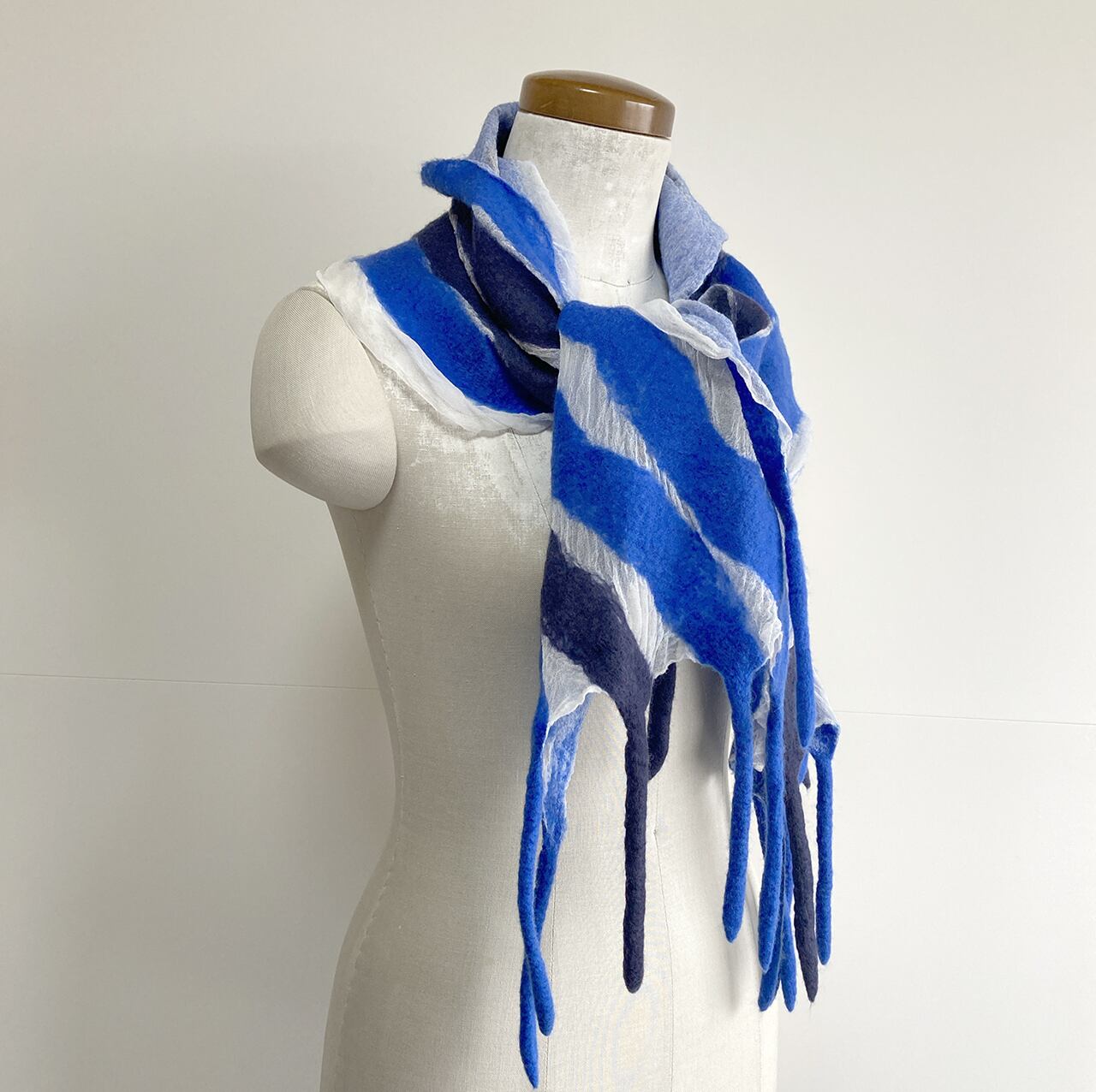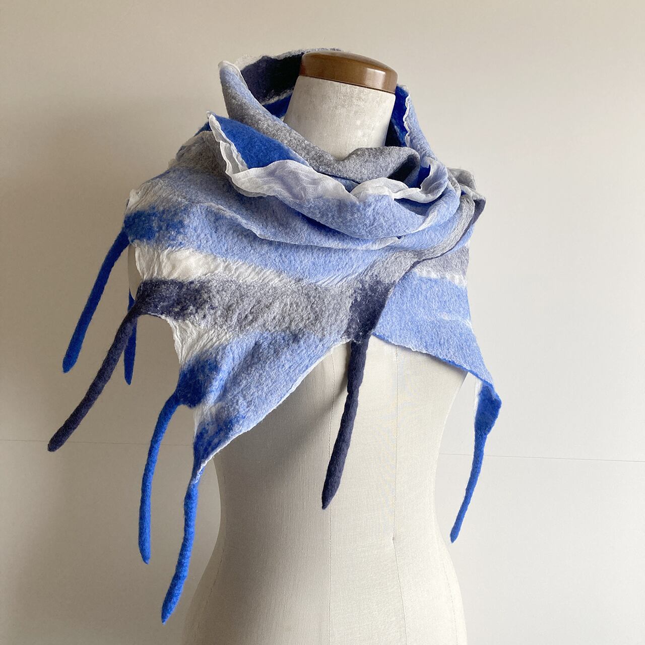 明るく綺麗な青とブルーグレーの羊毛が爽やかな印象。