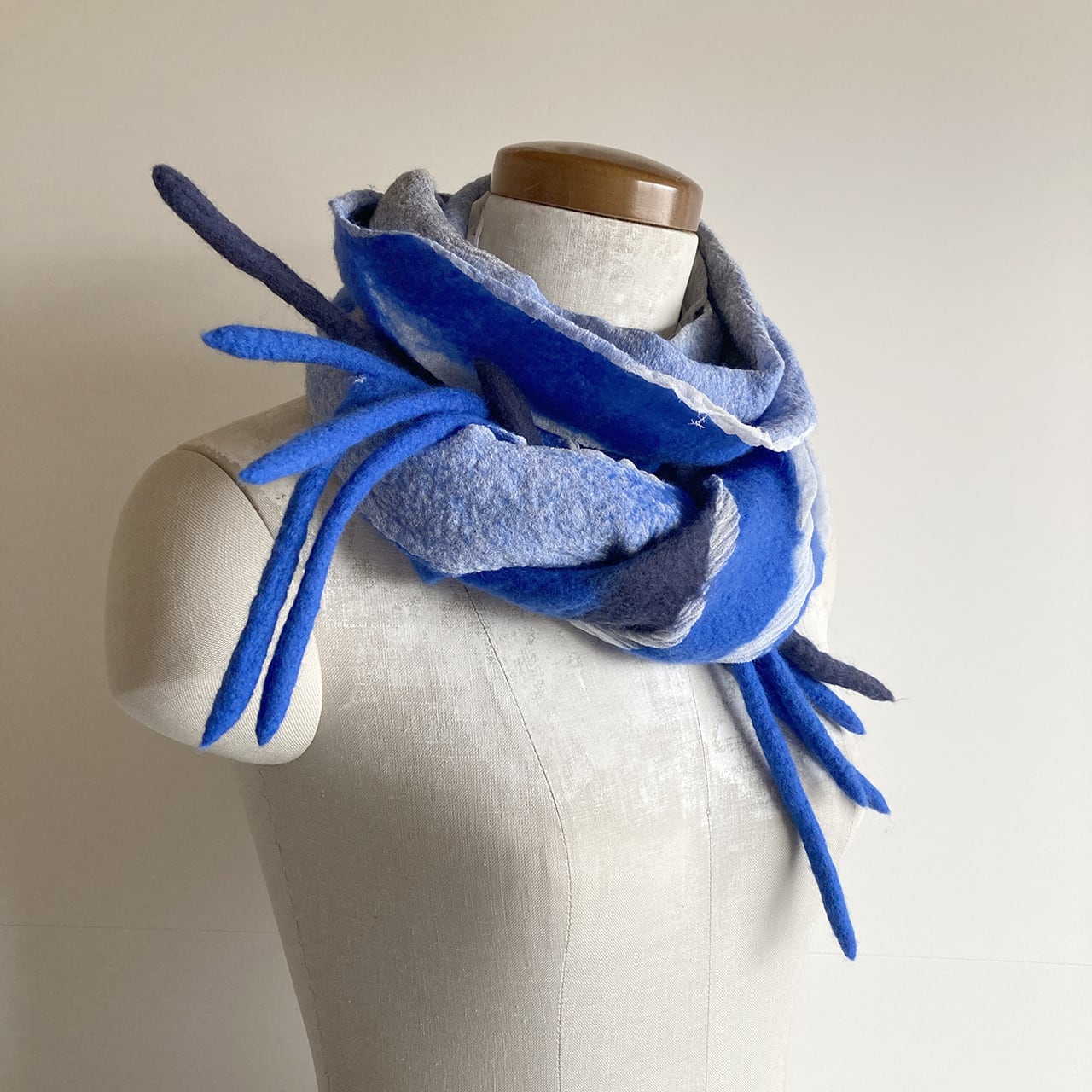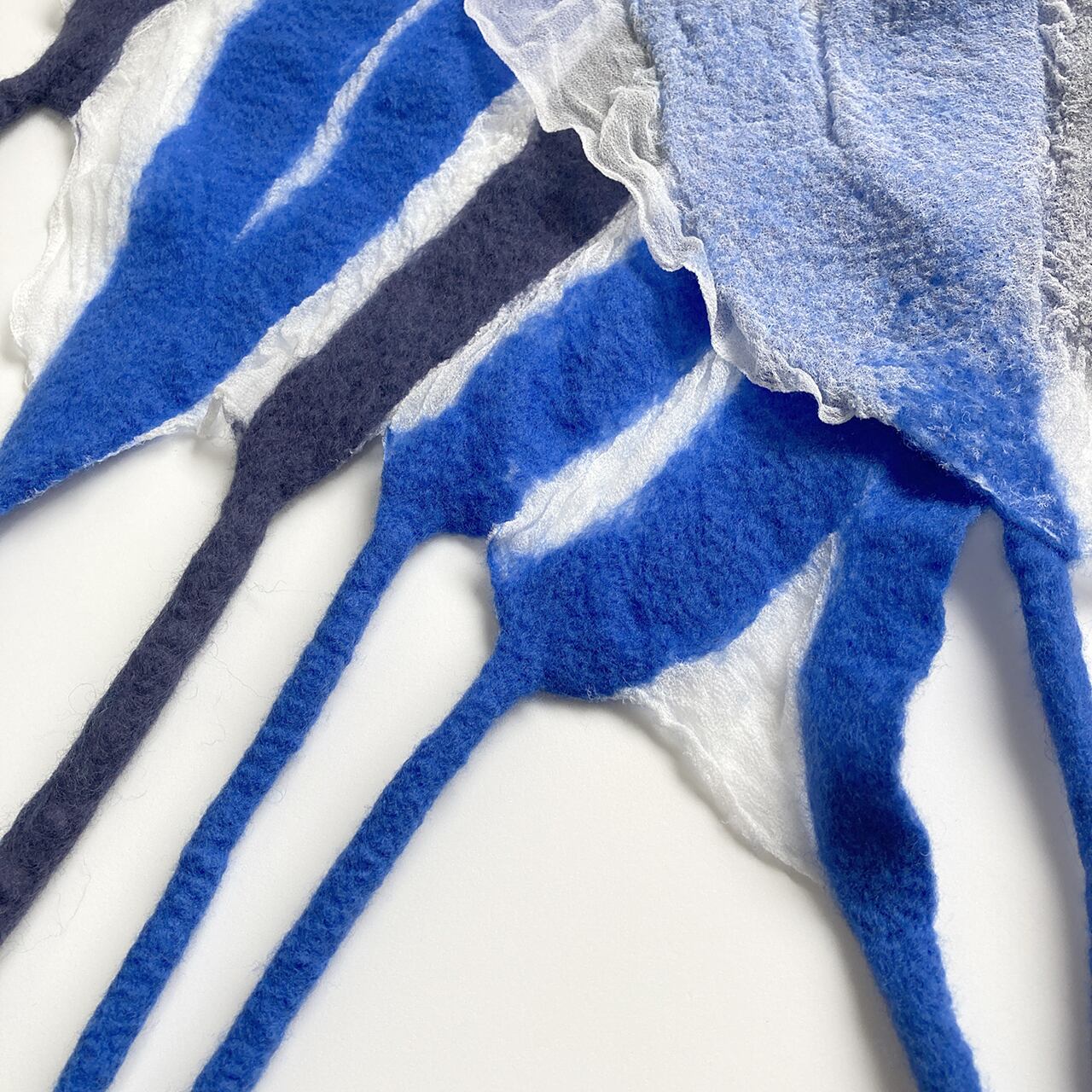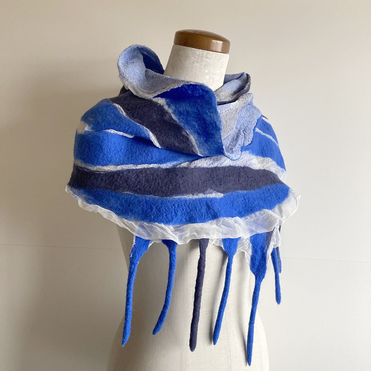 明るく綺麗な青とブルーグレーの羊毛が爽やかな印象。