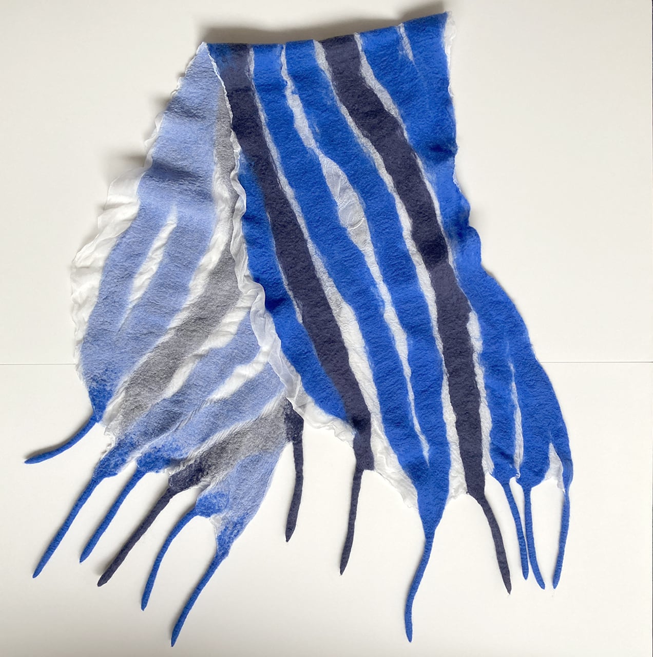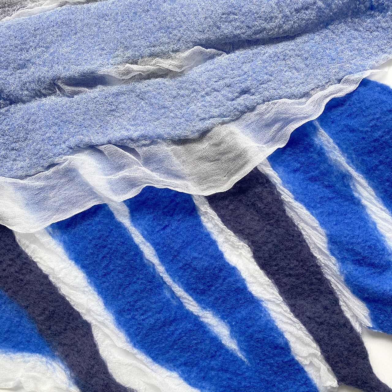 羊毛が縮む時にシルク布も絡めながら縮むので、ちりめんのような細かなシワが立体的な表情を生む。部分的な透け感、表と裏の色や質感による変化、長めのフリンジが楽しい。春先まで使えます。シワが特徴のためクシャッとバッグに入れておけます。