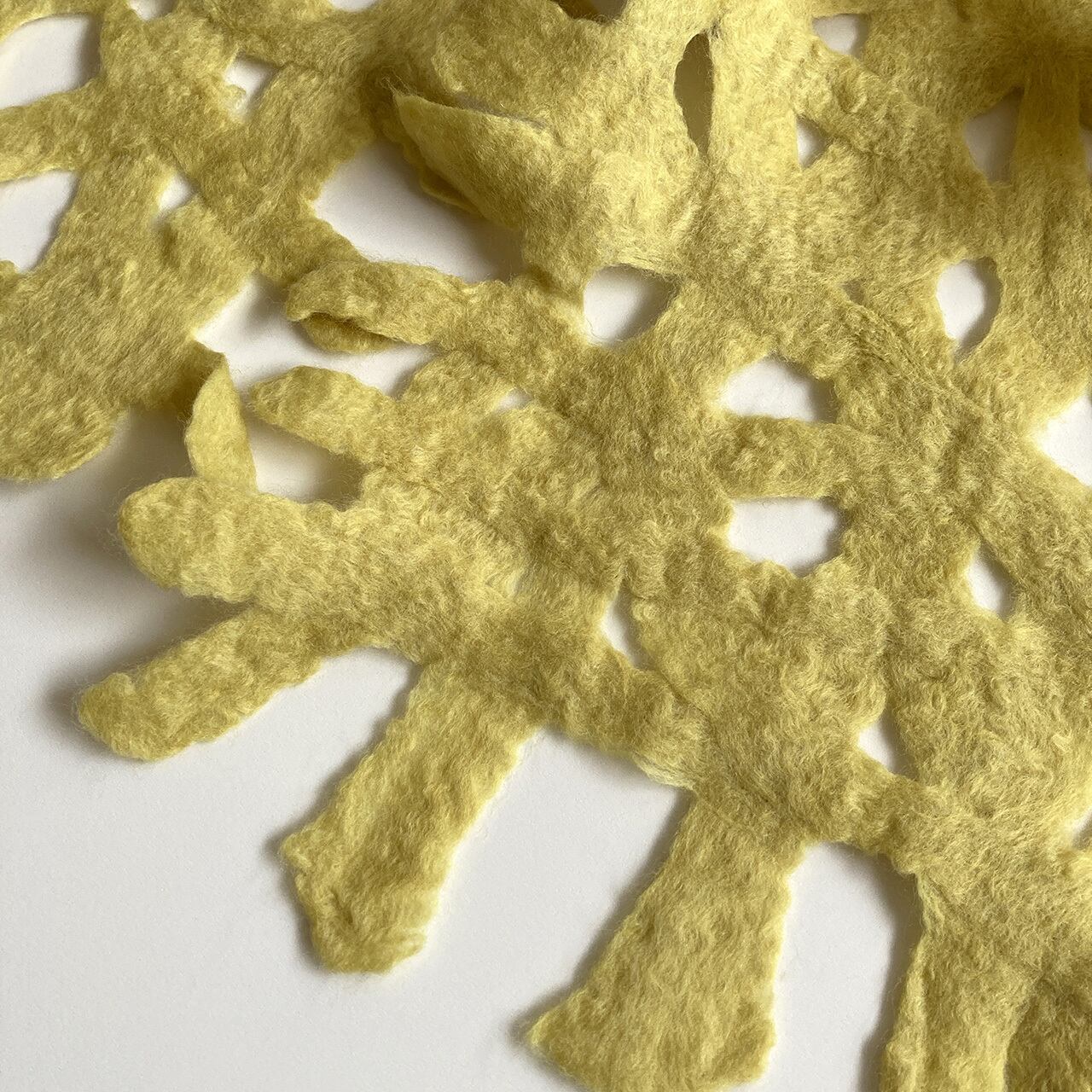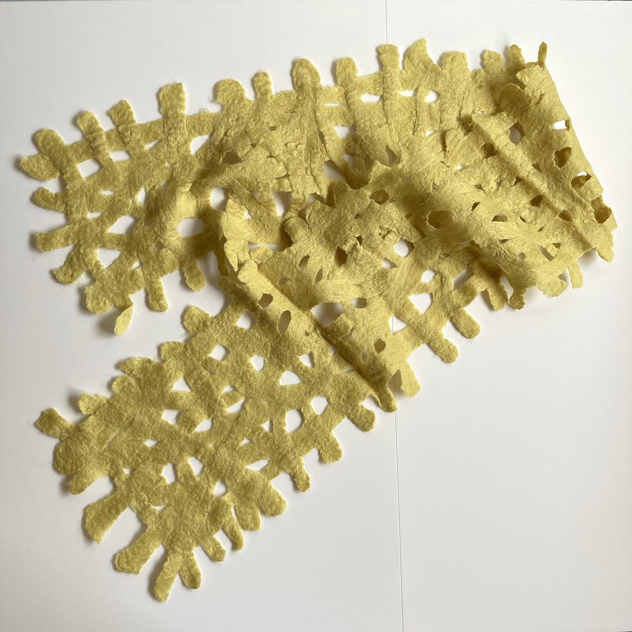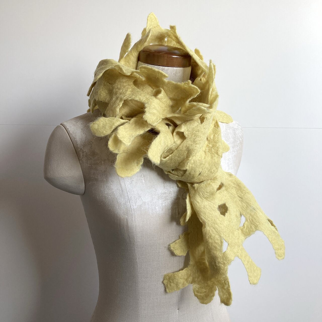 メリノ種の柔らかな羊毛を網目状に絡み合わせたストール。この網目のために巻くきやすく、隙間に空気が含まれてあたたかい。端のフリンジがいろんな方向に立ち上がってとても立体的。