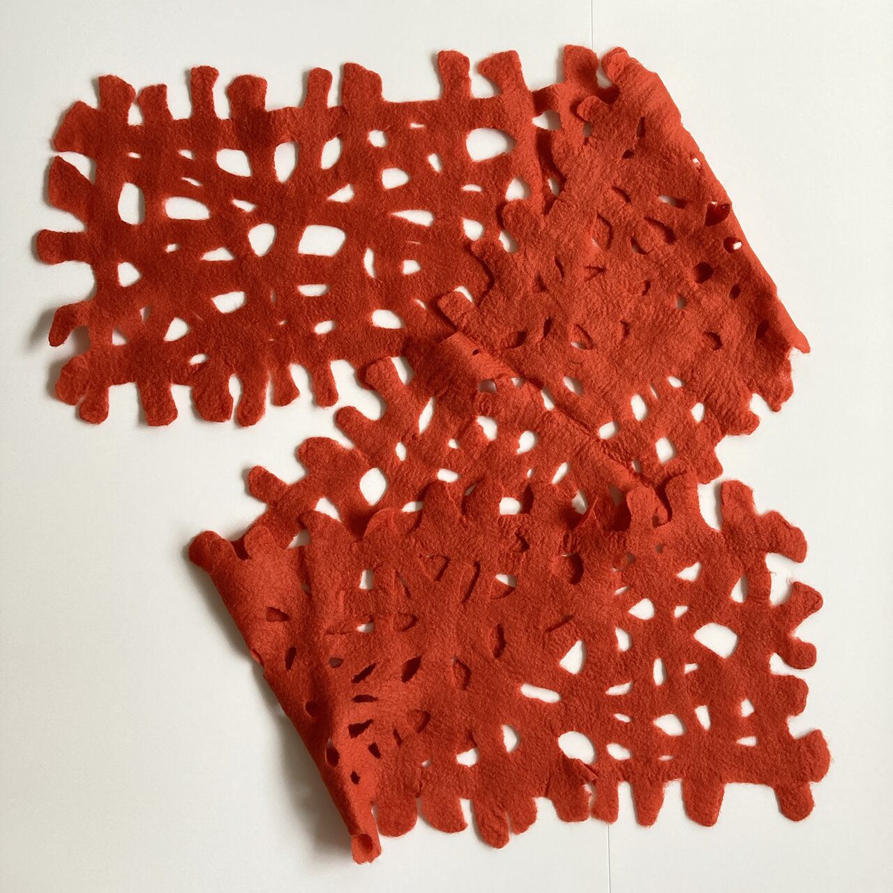 華やかで、深いオレンジ色。メリノ種の柔らかな羊毛を網目状に絡み合わせたストール。この網目のために巻くきやすく、隙間に空気が含まれてあたたかい。端のフリンジがいろんな方向に立ち上がってとても立体的。