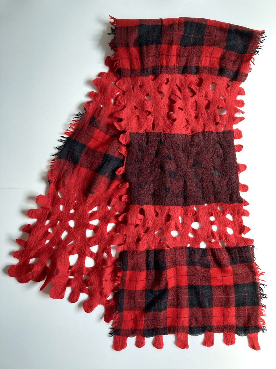 赤のメリノ種の羊毛と、赤と黒の鮮やかなチェックの布、シルクの薄い布とか絡まりあって